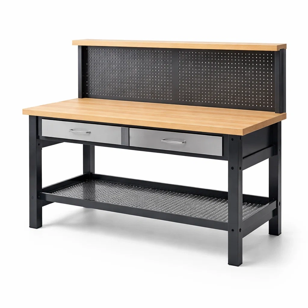 Établi avec plateau en bois et structure en métal. Comprend des tiroirs en acier inoxydable.